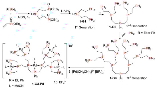 The first example of dendrimers constituted of phosphines at each branching point was a relatively small compound, as the branches were constituted of only three bonds, but it was a third-generation dendrimer. This family of compounds was synthesized by the repetition of the sequential addition of diethyl vinylphosphonate to primary phosphines, in the presence of AIBN (azobisisobutyronitrile), followed by reduction with lithium aluminum hydride. The reaction of the third generation dendrimer 1-G3 with [Pd(CH3CN)4][BF4]2 afforded the complex 1-G3-Pd shown in Scheme 1. This complex was used as a catalyst in the electrochemical reduction of CO2 to CO. This is one of the very first examples of the use of dendrimers in catalysis [8].