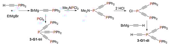 Very small phosphine dendrimers (first generations) having acetylene as branches were synthesized. The reaction of bromo[(diphenylphosphino)ethynyl] magnesium with PCl3 afforded the compound 3-G1-tri. This compound was characterized by the presence of two signals in 31P NMR, a quadruplet at −87.5, and a doublet at −31.4 ppm (JPP = 4.8 Hz), corresponding to the phosphine at the core, and to PPh2 groups, respectively. Another attempt was made by reacting the same Grignard reagent with Me2NPCl2, followed by the reaction with HCl, then with BrMgC≡CH, to afford compound 3-G1-di (Scheme 3). This compound is potentially suitable to continue the growing of the dendrimer, but it was isolated in too small a quantity to perform the next step [10].