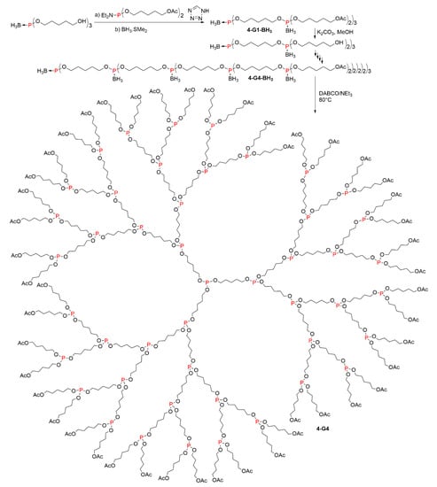 A series of phosphite dendrimers was synthesized by deprotection in the final step of boranophosphate triesters. The synthesis begun from tris(5-hydroxypentyl)boranophosphate, used as core. The synthetic strategy consisted in the first step in a phosphitylation of alcohol groups with the phosphoramidite Et2N-P(O(CH2)5OAc)2, followed by the addition of BH3.SMe2. Such a methodology will be described in more detail in Section 4 of this review. The second step was the cleavage of the terminal acetate functions with saturated K2CO3 in methanol, to generate alcohol terminal functions on which the two-step synthesis was carried out again. The synthesis was carried out up the fourth generation 4-G4-BH3 (Scheme 4). All compounds displayed in 31P NMR a very broad quartet at 115 ppm (1J31P–11B ≈ 124 Hz). Removal of BH3 was carried with DABCO (1,4-diazabicyclo(2.2.2)octane) in NEt3 at 80 °C, to afford the phosphite dendrimers up to the fourth generation 4-G4. The 31P NMR spectra displayed only a single signal at about 139 ppm for all the phosphite dendrimers, even 4-G4 [11].