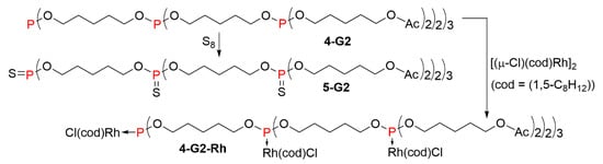 The second generation of the phosphite dendrimer 4-G2 was reacted with an excess of elemental sulfur to afford the corresponding thiophosphate 5-G2 (Scheme 5). The 31P NMR spectrum displayed three distinct signals at 68.50, 68.56, and 68.60 ppm in the 6:1:3 ratio, respectively. Complexation experiments were carried out on 4-G2 with the rhodium(I) dimer [(μ-Cl)(cod)Rh]2, affording the dendritic complex 4-G2-Rh. The complexation was characterized in the 31P NMR spectrum by the presence of a doublet at 117.9 ppm (1JP-Rh = 240.8 Hz). Complexation of dendrimer 4-G2 was also carried out with 5 equivalents of [PdCl2(cod)]. Complexation of one Pd necessitates two phosphite groups, which can occur in different ways inside the dendrimer structure, thus the formation of a single defined product appears unlikely, and is not represented here. However, 31P NMR spectroscopy confirmed the complexation of all phosphite groups, with the appearance of a single signal at 94.6 ppm, to be compared to 139.6 ppm for the non-complexed phosphite dendrimer 4-G2 [11].