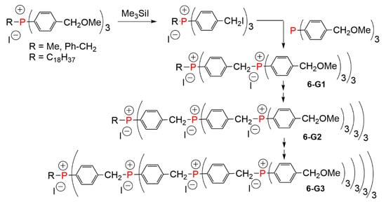 The very first example of phosphorus-containing dendrimers was based on quaternary phosphonium salts at each branching point. The core, as well as the branching units, were derived from tris(p-methoxymethylphenyl) phosphine. Successive generations were obtained via treatment of the benzylic alkyl ether with iodotrimethylsilane, affording benzylic iodide. The second step was the quaternization of tris(p-methoxymethylphenyl) phosphine with the benzylic iodide, to afford the subsequent generation (Scheme 6). In the first examples, the R group at the core of compound 6-G2 was either methyl or benzyl [3]. In the following examples, an octadecyl chain was an additional R group, and the dendrimers were synthesized up to the third generation, having 81 terminal functions [12].