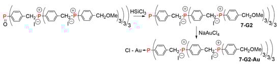 The same family of dendrimers was synthesized starting from a phosphine oxide at the core, up to the second generation. The phosphine oxide was then reduced with HSiCl3, to afford the free phosphine 7-G2. In a last step, the phosphine was used for the complexation of gold, affording 7-G2-Au (Scheme 7) [13]. In another experiment, a phosphorane was used as a very original quinque-directional core for the synthesis of the first generation phosphonium dendrimer (Figure 3) [13].