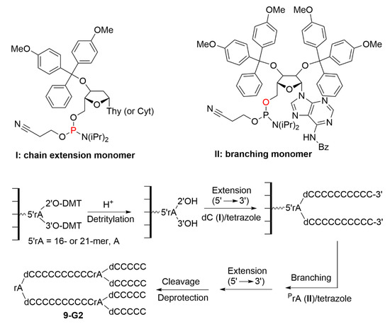 Another report concerned an analogous method, but was carried out using a divergent process. The divergent-growth strategy should remove the steric and geometric constraints encountered in the convergent approach, especially when coupling the neighboring oligomers as shown in Scheme 8. In this new experiment, the chains were constituted of cytosine (C), whereas the branching units comprised adenosine (A). One phosphoramidite was used for chain extension (compound I in Scheme 9), and another one was used as a branching unit (compound II in Scheme 9). The synthesis starts with the adenine branching monomer (II), eventually linked to the solid support via a 16- or 21-mer. The average coupling yield of the bulky branching ribonucleoside (compound II) was low, ca. 65–95%, when compared to the >95% yield obtained with the linear deoxynucleoside monomer (compound I). The main reason is that the 5′-amidite moiety in compound II is less accessible to coupling, due to the steric hindrance in its environment. After cleavage from the solid support and deprotection, the second generation dendrimer 9-G2 was finally obtained, as shown in Scheme 9 [16].