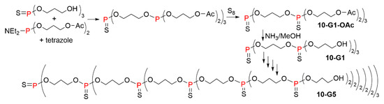 - Salamonczyk, G.M.; Kuznikowski, M.; Skowronska, A. A divergent synthesis of thiophosphate-based dendrimers. Tetrahedron Lett. 2000, 41, 1643–1645. [Google Scholar] [CrossRef]