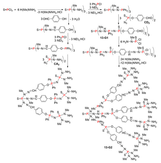 Smaller dendrimers were obtained using also the Staudinger process. Two methods are shown in Scheme 13, both starting with the synthesis of the thiophosphotrihydrazide S=P(NMeNH2)3. In a first attempt, the next step was a condensation reaction with hydroxybenzaldehyde, followed by the grafting of Ph2P to the phenol groups. The next and last step in this series was the Staudinger reaction with the thiophosphine azide N3P(S)(NMeNH2)2 (CA2). However, this reaction proceeded very slowly, even in refluxing THF, and it was impossible to totally avoid oxidation of the phosphine, thus the synthesis was stopped at this step. Another synthetic process was elaborated from the same thiophosphotrihydrazide, to which Ph2P was directly grafted. Only one Ph2P per NH2 group reacted. The reaction with the azido dialdehyde CD2 proceeded easily at 0 °C, affording compound 13-G1. Another process was used to continue the growing of the dendrimer, i.e., the condensation of the aldehydes with the phosphorhydrazide H2NNMeP(S)Cl2. The next step was the grafting of methylhydrazine on the P(S)Cl2 terminal functions. The purity of compound 13-G2, having NH2 terminal functions, was not perfect, presumably because a small part of methylhydrazine (less than 10%) reacted with the P(S)Cl2 functions on the NH2 side instead of the desired NHMe side, thus the synthesis was stopped at this step [32].