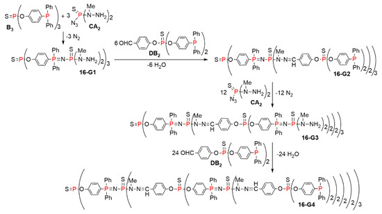 This concept was then expanded to the use of other types of complementary branched monomers. For this purpose, the branched monomers CA2 and DB2 were synthesized, where A, B, C, and D are the same functional groups than in Scheme 15. These monomers were used for the synthesis of another type of layered dendrimer, up to the fourth generation 16-G4, as shown in Scheme 16. The terminal functions were alternatively either hydrazine or phosphines, and the by-products were either N2 or H2O, as in the previous case [37].