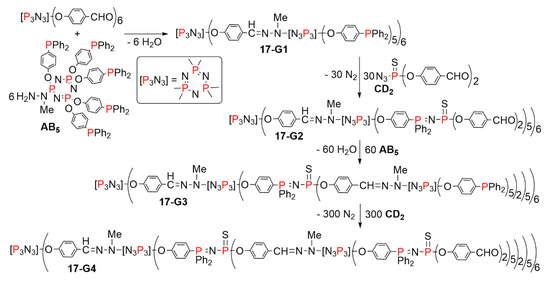 Using the same principle, highly branched monomers of types AB5 and CD5 were synthesized thanks to the specific reactivity of the cyclotriphosphazene [N3P3], in which it is possible to differentiate the reactivity of one function from that of the five other functions [38]. In a first attempt, the crowded AB5 monomer based on [N3P3] was used together with the CD2 monomer, as shown in Scheme 17. The synthesis was carried out up to the fourth generation. The use of the AB5 monomer at two steps induced a very large increase of the number of terminal functions. Indeed, the fourth generation 17-G4 possesses 600 aldehyde terminal functions, to be compared with only 48 aldehyde terminal functions for the fourth generation 15-G4 [39].