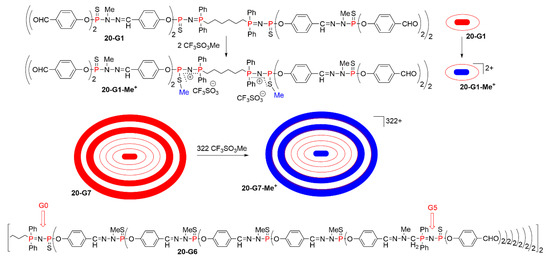 Alkylation on sulfur of P=N-P=S linkages of a first-generation dendrimer, and schematization of the same reaction on a generation 7 dendrimer, having 2 P=N-P=S linkages at the core, 64 at the level of the fifth generation, and 256 at the seventh generation. The structure of 20-G6 showing the place of two layers of P=N-P=S linkages.