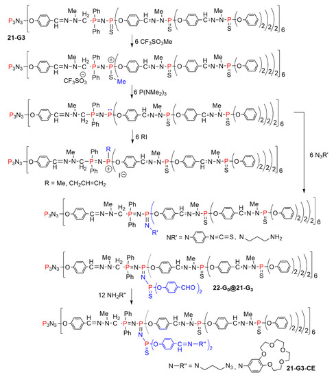 Alkylation of the P=S groups induces a weakening of the bond between phosphorus and sulfur, which can be cleaved with a nucleophilic phosphine such as P(NMe2)3. Such a reaction generates highly reactive trivalent phosphorus atoms (PIII) inside the structure of dendrimers. A versatile reactivity was developed from these PIII atoms. Reaction with methyl or allyl iodide generated phosphonium salts at precise layers inside the structure. However, the most important reaction was the Staudinger reaction with functionalized azides, which permitted the grafting of isothiocyanate, primary amine, or aldehyde internal functions, while generating P=N-P=N-P=S linkages. These reactions were carried out with several dendrimers, but are illustrated in Scheme 21 only on the third-generation dendrimer 21-G3, having 6 P=N-P=S linkages in its structure. The aldehydes of dendrimer 22-G0@21-G3 were then used in condensation reactions with amines, leading to the internal grafting of azides or crown ethers (21-G3-CE, Figure 13) [43].