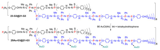 Besides the alkylation of the sulfur atom, the P=N-P=S linkages are suitable for the complexation of metals, in particular of gold [50]. Several of the dendritic structures shown in the previous paragraphs incorporating P=N-P=S linkages in some parts of their structure were used for the complexation of gold. Only one example is shown in Scheme 25. It concerns the dendritic structure 23-G3@21-G3, in which only the new branches, containing P=N-P=S (or P=N-P=N-P=S), are able to complex gold. The complexation after reaction with Au-Cl(tht) (tht = tetrahydrothiophene) was easily detected by 31P NMR. Indeed, before complexation the P=N-P=S linkages of compound 23-G3@21-G3 are characterized by two doublets at ca. 13 ppm (P=N) and ca. 52 ppm (P=S), with 2JPP = 31 Hz. These doublets disappeared after complexation, on behalf of the appearance of two other doublets at ca. 14 ppm (P=N) and ca. 35 ppm (P=S-Au), with 2JPP = ca. 18 Hz for compound 25Au-G3@21-G3. The signal corresponding to the P=S groups not included in P=N-P=S linkages did not change (ca. 62 ppm before and after addition of AuCl(tht)), indicating that they were not involved in the complexation [51].