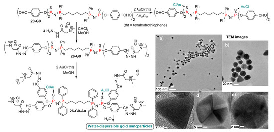 The same type of complexation was recently carried out with a small dendrimer of the 20-Gn family. It was reacted with the Girard’s T reagent to afford the water soluble derivative 26-G0. Reaction with AuCl(tht) afforded as expected the corresponding complex 26-G0-Au (Scheme 26). This compound is a white solid, stable for at least several months in the solid state, which afforded colorless solutions in organic solvents. However, a red solution was obtained when dissolving this dendrimer complex in water. Analysis of this water solution by TEM (transmission electron microscopy) revealed the presence of gold nanoparticles. High resolution TEM (images c, d, and e in Scheme 26) showed that the form of all nanoparticles was either triangles or associated triangles of gold atoms. The dendrimer 26-G0-Au acted simultaneously as a mild reducer (AuI −> Au0) and as a nanoreactor, favoring the self-assembly of gold atoms and promoting the growth and stabilization of isolated gold nanoparticles. The reduction is probably due to the release by hydrolysis of the hydrazine bond of a small quantity of the Girard’s T reagent, able to act as a reducing agent. This is an unprecedented method for the synthesis of colloidal suspensions of water-soluble gold nanoparticles [52].