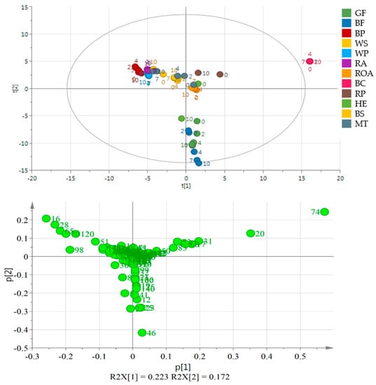 Principal component analysis (PCA) and the loading plot of all analyzed oils stored at 60 °C for 0, 2, 4, 7 and 10 days. On the loading plot compounds responsible for differentiation are placed far from the plot center. 16—pentanal, 28—hexanal, 120—acetic acid, 20—3-thujene, 46—1-penten-3-ol, 51—2-heptanone, 65—2-pentyl furan, 70—1-pentanol, 74—trans-β-ocimene, 98—1-hexanol. Sample coding as in Table S3.