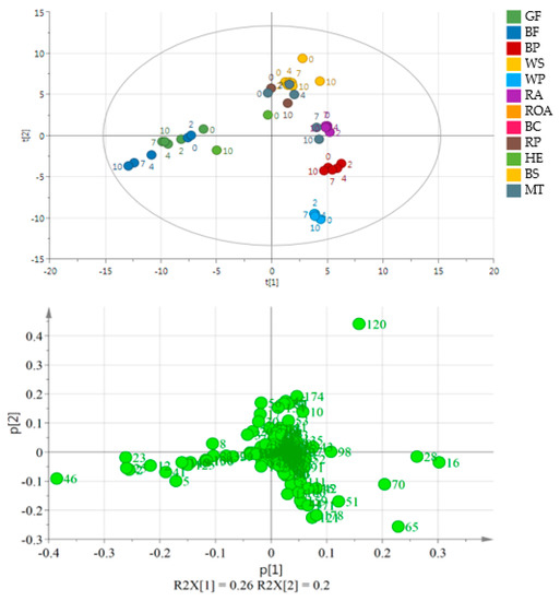 PCA and the loading plot of analyzed oils (except for BC and ROA) stored at 60 °C for 0, 2, 4, 7 and 10 days. On the loading plot compounds responsible for differentiation are placed far from the plot center. 2—propanal, 12—2-ethyl furan, 16—pentanal, 23—1-propanol, 25—2-butenal, 28—hexanal, 46—1-penten-3-ol, 65—2-pentyl furan, 70—1-pentanol, 120—acetic acid. Sample coding as in Table S3.