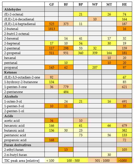 Oxidative changes during storage can be observed on Figure 2 and Figure 3 in the case of flaxseed oil of both varieties, but also for hemp oil (all these oils did not form a uniform cluster, but the distances between particular storage days were distinguishable). Figure 4 helps to visualize the changes in volatile compounds for those oils in which changes were most significant. Compounds were classified into main groups of volatile lipid oxidation products. It summarizes results for 6 oils in which the changes were most significant. For the remaining oils, no tenfold or more increase in the peak areas of particular compounds was noted, which was a criterion for selecting autooxidation volatile markers. Figure 4 shows numbers in particular cells indicating how many times the peak area for a given compound increased during accelerated storage (Schaal Oven Test) experiment. The cells are also color-coded indicating the size of the peaks of particular compounds. As a non-targeted approach was used for the analysis of volatile compounds, TIC peak areas were compared. From Figure 4, compound characteristics for particular oil can be selected, which were represented by peaks of the biggest area, as well as the most pronounced increase during accelerated storage test. The most radical increase in lipid oxidation products was noted for flaxseed oil (GF and BF) and also for Hemp oil (HE). To lesser extend the increase in volatile compounds was noted for poppy seed oils (BP, WP) and milk thistle (MT). Interestingly, hexanal was not the best marker of oxidation for oils shown in Figure 4. The highest amount of C18:3 in flaxseed oils and in hemp oil resulted in their rapid oxidation in the test, with a dominating unsaturated aldehydes (2-alkenals and 2,4-alkadienals) share in volatile compounds.