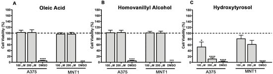 2.1. Impact of Oleic Acid, Homovanillyl Alcohol, and Hydroxytyrosol on A375 and MNT1 Melanoma Cell Viability
