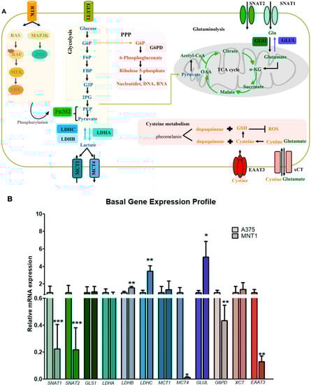 2.2. Metabolic Gene Expression in A375 and MNT1 Melanoma Cells