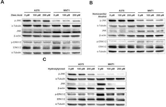 2.4. Effects of Oleic Acid, Homovanillyl Alcohol, and Hydroxytyrosol on the Activation of ERK and JNK Molecular Pathways in A375 and MNT1 Melanoma Cells