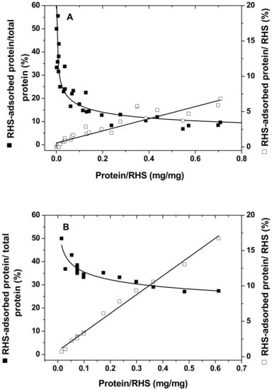 To extend our previous study, soybean LOX with a relative molecular mass of 102 kDa and pI of 5.65 [45], the first enzyme in the oxylipin biosynthetic pathway, was immobilized on RHS by adsorption, and the efficiency and capacity of binding was evaluated. Bovine serum albumin (BSA), with a relative molecular mass of 66 kDa and pI of 5.4 [46], was included as a typical globular control protein. A fixed amount (20 mg) of RHS was challenged with 0.2–12 mg LOX (see Section 3). Results were evaluated and are presented in Figure 1, which shows the percentage of adsorbed protein and the ratio (w/w) of target protein (LOX or BSA) to RHS, as a function of total added protein (Y axis).