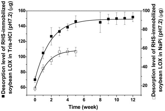 The kinetic stability (i.e., desorption kinetics) of RHS-adsorbed soybean LOX was examined over several weeks in a storage buffer. Because the surface of RHS is rich in anionic functional groups derived from sialic acid with pI value of 2.9 [52], desorption kinetics were analyzed and compared in a cationic buffer of 50 mM Tris-HCl (pH 7.2), and an anionic buffer of 50 mM sodium phosphate (pH 7.2). The amount of desorbed LOX was 70 μg (28%) in Tris-HCl (pH 7.2) and 17 μg (7%) in 50 mM sodium phosphate (pH 7.2), such that 72% or 93% of the enzyme input was retained on RHS in the two buffer systems, respectively (Figure 2). These data indicate that an anionic buffer is preferred to support the binding of soybean LOX to RHS, most likely because anionic features on the RHS surface, such as sialic acid, play a role in binding LOX to this matrix. In contrast, this type of interaction would likely be suppressed in the presence of a cationic buffer. Figure 2 also shows that the desorption kinetics of RHS-adsorbed LOX is hyperbolic with maximal desorption of 56 µg (23%) soybean LOX in a sodium phosphate buffer and maximal desorption of 155 μg LOX (55%) in a Tris-HCl buffer, under the assay conditions used here. Therefore, the stability of RHS-adsorbed soybean LOX is greater in the sodium phosphate buffer than in the Tris-HCl buffer. Furthermore, the desorption kinetics reached saturation after 3 weeks in sodium phosphate (pH 7.2) and after 5 weeks in 50 mM Tris-HCl (pH 7.2). The results in Figure 2 suggest that the anionic buffer works better than the cationic buffer for maintaining the stability of RHS-adsorbed LOX.