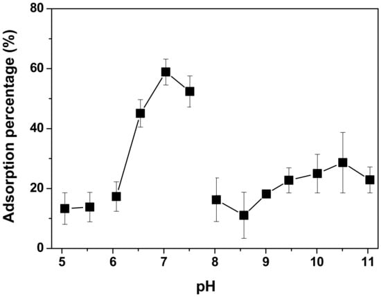 Because ionization of the functional groups on the RHS surface, such as sialic acid, may play an important role in the adsorption of soybean LOX, pH was examined as a modulating factor for enzyme immobilization by adsorption on RHS. For this purpose, four buffer systems were tested, covering a wide pH range from 5.06 to 11.4 (see Section 3). All buffers were anionic, except the Tris-HCl buffer which was used at pH 8.03 and 8.57. The pH dependence of the adsorption percentage of soybean LOX on RHS is shown in Figure 3. A maximal binding efficiency of 60% was achieved at pH 7.2 in 50 mM sodium phosphate. The slight increase in adsorption percentage at a high pH could be due to the precipitation of denatured LOX under harsh conditions.