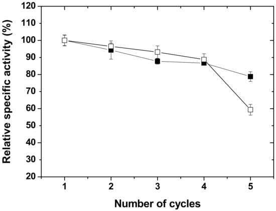 The most important advantage of immobilizing an enzyme on a matrix surface is that it allows the enzyme to be used repeatedly, achieving multiple reaction cycles with increased thermal stability [53]. Here, the operational stability of RHS-adsorbed soybean LOX, as indicated by the relative enzyme specific activity, was analyzed over five sequential reaction cycles and compared with that of covalently RHS-immobilized soybean LOX [33]. As expected, the specific activity of RHS-adsorbed soybean LOX gradually decreased with each successive reaction cycle (Figure 4).