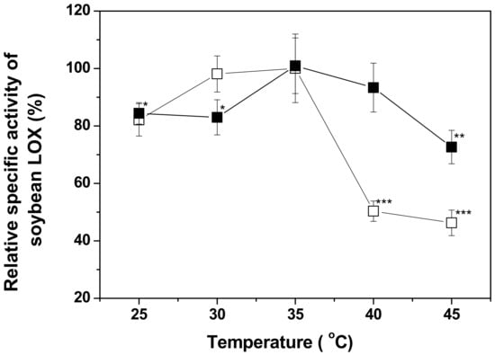 Temperature dependence of soybean LOX activity. Free (□) or RHS-adsorbed (■) soybean LOX in 50 mM sodium phosphate was incubated at 25, 30, 35, 40 and 45 °C for 30 min. Enzyme specific activities were measured as described in the Section 3. The specific activity at each temperature was normalized to the activity at 35 °C, and their significant differences were verified by using Student’s t-test (*: p < 0.1, **: p < 0.05, *** p < 0.001).