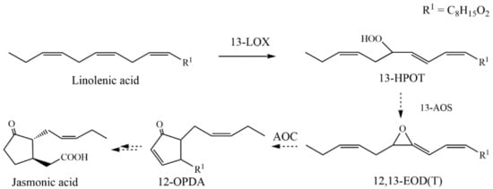 Soybean lipoxygenase (LOX, EC.1.13.11.12) catalyzes the first step in the octadecanoid pathway, which produces diverse oxylipin derivatives including jasmonic acid (JA). The primary substrates of LOX are α-linolenic acid (LnA) and linoleic acid (LA), which are released from the chloroplast membrane by phospholipase C and then converted by LOX into their corresponding hydroperoxyl derivatives [1,2,3,4]. JA is a ubiquitous plant stress hormone whose synthesis is triggered by various biotic and abiotic environmental stimuli. It has been suggested that JA and its analogues protect plants from damaging insects [5] and that they have potential as noncytotoxic chemotherapeutic agents [6,7,8]. Biosynthesis of JA is initiated by 13-LOX, which oxygenates LnA into 13-hydroperoxy octadecatrienoic acid (13-HPOT). Allene oxide synthase (AOS) converts 13-HPOT to an unstable 12,13-epoxy octadecatrienoic acid (12,13-EOT), which is then metabolized to 12-oxo-phytodienoic acid (12-OPDA) by allene oxide cyclase (AOC). Finally, 12-OPDA is reduced to 3-oxo-2-(2′-pentenyl)cyclopentane-1-octanoic acid (OPC 8:0) by 12-oxo-phytodienoate reductase (OPR), which is converted to JA by three cycles of β-oxidation (Scheme 1).