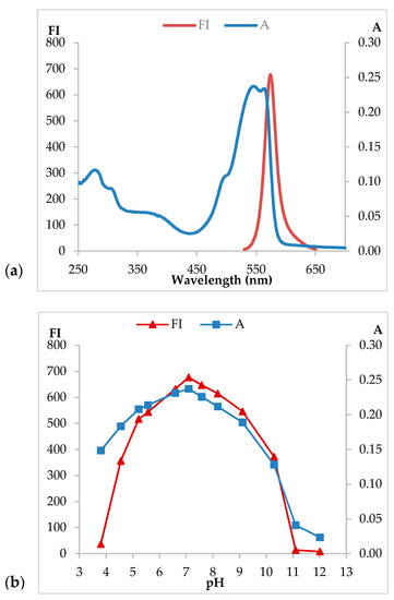 B-PE was excited at 465 nm to record the fluorescence spectra of the protein extract at different pH (Figure 1b). At neutral pH, the fluorescence maximum is registered at 575 nm. The spectrum maintains its profile and registers high values of fluorescence intensity (FI) between pH 6.0 and pH 9.0. The intensity of the peak decreases at pH lower than 6 and higher than 9. These results are in accordance with absorbance determinations showing instability in highly acidic or basic media.