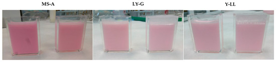 Photographs showing a vivid presentation of the market products and milk-based products obtained using the B-PE extract as a natural colorant: in this figure, three representative samples are shown: sample A, representing milkshakes (MS-A); sample G, representing liquid yogurts (LY-G); and sample LL, representing yogurts (Y-LL). In each pair of photos, on the left is the reference product found in the market and on the right is the sample obtained using the B-PE extract.
