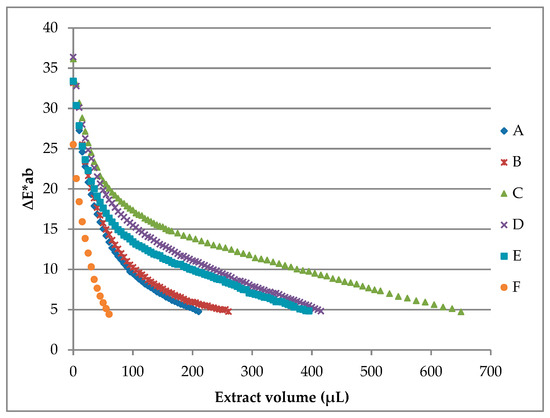 Six different commercial milkshakes were studied to test the potential coloring capacity of the B-PE extract (Table 2). Thus, as most of the final ΔE*ab values reached were below or very close to 5 (Figure 3), coloring curves obtained from milkshakes suggest that the B-PE coloring extract has good coloring properties.