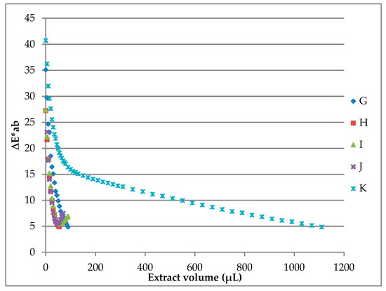 With the exception of product “K”, the rest of the samples required very small extract volumes for achieving the desired color. Thus, staining factors were between 3.98 and 7.15 mg/L from products “J” and “G”, respectively. As an exception, the staining factor of “K” liquid yogurt was quite high (82.9), being 21 times higher than the staining factor of “H” liquid yogurt.