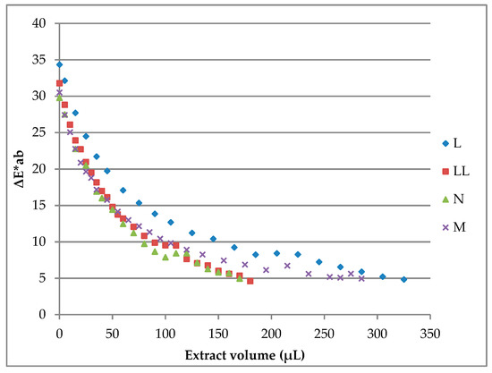 Coloring curves of all assayed semisolid yogurts showed excellent ΔE*ab values. All final ΔE*ab values were equal to or lower than 5, suggesting that the color of each sample was highly similar to the color of its reference commercial product. Overall, staining factors were low, with sample “N” requiring the lowest amount of extract and sample “L” requiring the highest (Table 2).