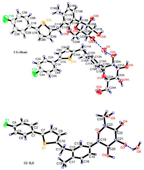 ORTEP (Oak Ridge Thermal Ellipsoid Plot Program) diagrams of CG-Hemi and CG-H2O. There are two CG molecules and one water molecule in CG-Hemi. There are one CG molecule and one water molecule in CG-H2O.