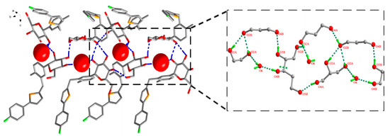 The analysis of the strong hydrogen bonding pattern showed that in the crystal structure of CG-H2O, two adjacent CG molecules formed CG dimers by intermolecular hydrogen bond O2–H2···O4 (Symmetry code: −1 − x, 1/2 + y, Figure 3). Then these dimers were linked with abundant hydrogen bonds between CG molecules and water molecules along b-axis: O3–H3···O6 (Symmetry code: 1 + x, 1 + y, 1 + z), O5–H5···O6 (Symmetry code: −1 − x, −1/2 + y, −z), O6–H6A···O3 and O6–H6B···O2 (Symmetry code: −1 − x, −1/2 + y, −z). All H atoms of OH group and water molecules participated in the strong intermolecular O–H···O hydrogen bonds and generated supramolecular self-assembly (15), (7) ring motifs along b axis in CG-H2O and formed a two-dimensional structure (Figure 3), which were further connected by the hydrogen bond O4–H4···O5 (Symmetry code: −1 + x, 1 + y, 1 + z). Details of the hydrogen bond geometry of CG-H2O were listed in Table 2.