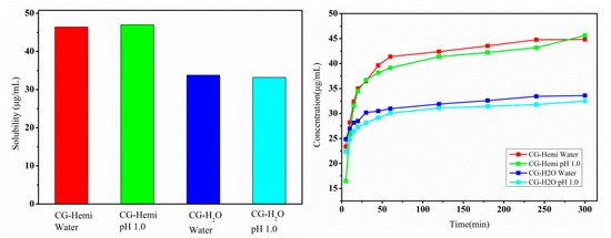 Solubility (left) and dissolution study (right) results of CG-Hemi and CG-H2O.