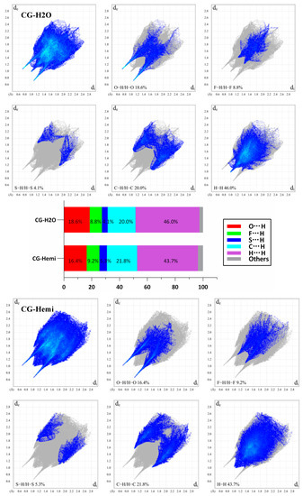 The two-dimensional fingerprint plots of Hirshfeld surface analysis were used to compare the intermolecular interactions between CG-H2O and CG-Hemi. The software of Crystal Explorer 17.5 was used for the calculations [14,15]. As shown in Figure 6, the results showed that H···H interactions were dominant both in the crystal structure of CG-H2O and CG-Hemi. The percentage of O···H/H···O interactions and H···H interactions for CG-H2O were higher than that of CG-Hemi, and F···H/H···F, S···H/H···S and C···H/H···C interactions for CG-H2O were lower than that of CG-Hemi. The intermolecular forces included hydrogen bonds, van der Waals forces, π···π interactions, etc. Among them, O···H/H···O interactions for CG-H2O mainly came from hydrogen bonding (O2–H2···O4, symmetry code: −1 − x, 1/2 + y; O3–H3···O6, symmetry code: 1 + x, 1 + y, 1 + z; O5–H5···O6 symmetry code: −1 − x, −1/2 + y, −z; O6–H6A···O3 and O6–H6B···O2, symmetry code: −1 − x, −1/2 + y, −z; O4–H4···O5, symmetry code: −1 + x, 1 + y, 1 + z). However, H···H interactions for CG-H2O might come from hydrogen bonding and van der Waals force, because there was no strong π···π stacking interaction in the crystal structure of CG-H2O. Therefore, we could include that CG-H2O had stronger intermolecular interactions (including hydrogen bonding and van der Waals force) than CG-Hemi [16].
