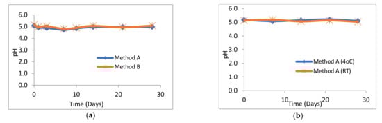 The content of losartan after preparation (day 0), prepared by both methods A and B, was found to be lower than expected at 80–81%, assayed by UV and confirmed by HPLC analysis. Subsequently, UV and HPLC analysis showed no significant difference in losartan content of suspensions stored at 4 °C and at RT over the 28 days storage. Chemical degradation of a drug may limit the shelf life of a preparation. A drug content ≥90% of the labelled amount is generally deemed to be acceptable [