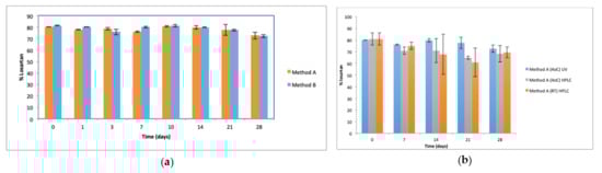 11] (method B), without and with addition of water, respectively. Losartan (as losartan potassium) concentration was measured over 28 days, using UV spectroscopy and a stability indicating HPLC method [