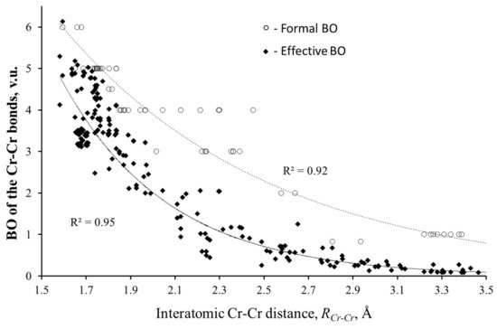 The problematic point in Cotton’s argument is his correlation of the bond lengths to the formal BOs, while Pauling’s Equation (2) relates them to the effective BOs. (The formal BOs for the cation–anion bonds are those expected from the formal oxidation state of the ions. For the metal–metal bonds, the formal BOs should be evident from the structure of molecular orbitals. It is defined as half of the difference between the numbers of bonding and antibonding electrons.) In contrast to the localized bonds, the effective BOs of the metal–metal interactions can significantly differ from the formal values. As it was shown [26], the difference may reach 1 valence unit (v.u.). As an example, Figure 1 presents formal and effective BOs of the Cr–Cr bonds as a function of their lengths. The effective BOs (Mayer, Wiberg, delocalization indices, etc.) were calculated by different authors for various compounds (the references of these studies can be found in [14]). As can be seen, in contrast to the formal BOs, the calculated BOs clearly follow exponential decay, in spite of the high dispersion of the data. A similar analysis of the effective BOs for various atomic pairs obviously confirmed the validity of Equation (2) for both localized and delocalized bonds [13]. The BV parameters of the TM–TM bonds obtained by fitting the exponential curves allow for a simple but careful calculation of the effective BOs from the TM–TM distances by Equation (2) [14,15,16].