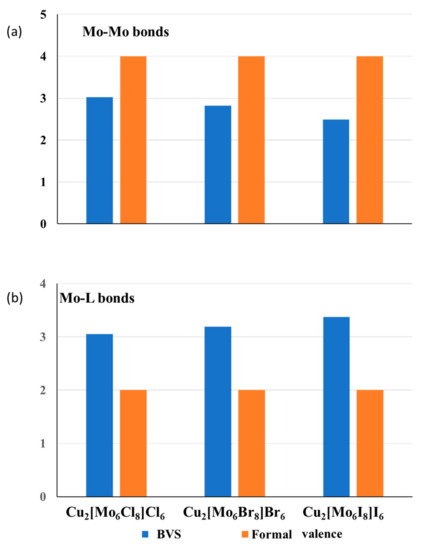 A reasonable question arises: “Does the stretching of the metal–metal bonds decrease the material stability?” The answer is rather negative because the valence deficiency caused by stretching is compensated by the valence excess related to the compression of the metal–ligand bonds. As can be seen from Figure 2b, the effective BVSs for the Mo-L bonds in Cu2Mo6L14 is effectively larger than the formal ones, and their rise with the ionic radius of the ligands corresponds to the BVS drop for the Mo–Mo bonds. The total BVS of the Mo atoms for all three compounds are close to 6, i.e., to the number of valence electrons of the Mo atom (Note that for Mo6 clusters in these compounds, all the electrons are bonding). In the general case, in accordance with the BO conservation principle, the total BVS for the metal atom, which includes the metal–metal (TM–TM) and metal–ligand (TM–L) bonds, is close to the expected number of valence electrons, lTM, responsible of bonding: