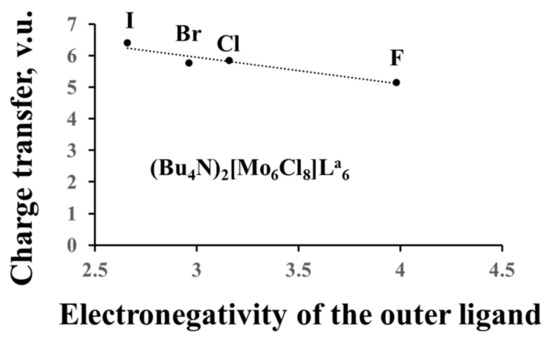 In the previous section, we dealt with formal charges of the clusters, but, based on the anion BVSs, we can calculate their effective charges and compare them to the formal ones. For example, the oxidation state of Re in the Re6-cluster compounds is +3, and the formal charge of the Re6-cation is equal to +18, while the effective charge is +26.4 for sulfides, +27.8 for selenides and +31.1 for tellurides (average data for few compounds). For the Mo6-cluster compounds with the Mo oxidation state of +2 (the formal charge of +12), the effective charge is equal to +18.2 for chlorides, +18.5 for bromides and +20.0 for iodides. Thus, the electron redistribution around TM metals in the cluster units, associated with the matrix effect, results in the charge transfer from the cluster (and from the outer ligands) to the inner ligands. As expected from the matrix effect, the value of the charge transfer from the cluster depends on the size of the inner ligands (Figure 4a), but we can also relate it to the ligand electronegativity (Pauling scale) (Figure 4b). The higher the latter, the smaller is the charge transfer. The influence of the outer ligands on the charge transfer is much less pronounced (Figure 5). Moreover, the cluster contribution to the BVSs of the outer ligands is almost unaffected by their composition, allowing easy mutual substitution of these ligands in the synthesis.