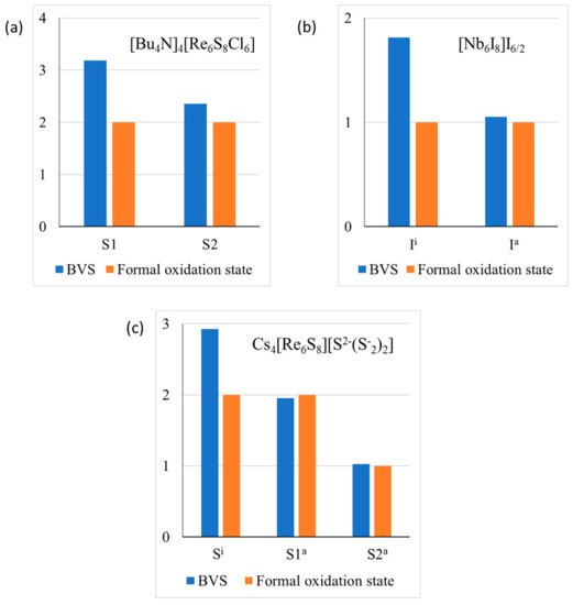 For example, in [Bu4N]4 [Re6S8Cl6], the inner and the outer ligands are presented by sulfur and chlorine, respectively. As a result, the valence violations (Figure 6a) are less pronounced than for pure chlorides or sulfides. In Nb6I11, each outer ligand is common to two adjacent clusters, resulting in minimal valence violations for these ligands (Figure 6b). In Cs4Re6S13 different mechanisms of the valence compensation is working. The outer ligand S1 is common for two adjacent clusters, while the formal valence of the outer ligand S2 is not −2, but −1 (Figure 6c). In this compound, contributions of Cs+ cations in the BVSs of the inner and outer ligands are relatively close and do not effectively diminish the valence violations.