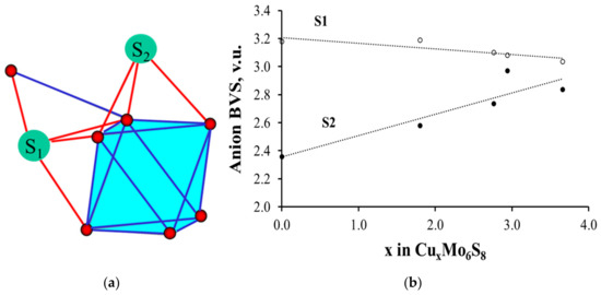 To illustrate this peculiarity, we chose Cu-containing Chevrel phases, CuxMo6S8, with accurately determined crystal structure [35], which is very close to that of MgxMo6S8 [42]. As can be seen in Figure 7, the BVSs of two crystallographically different sulfur atoms in Mo6S8 are completely different, in spite of the fact that both S1 and S2 atoms are inner ligands located at relatively close distances from the cluster center. The reason for the BVS distinction is their different bonding to the clusters (Figure 7a). S2 is connected only to one Mo6 cluster by three Mo–S bonds, while S1 has an additional bond to the adjacent cluster, for which it serves as the outer ligand. Thus, S1 has four Mo–S bonds with similar lengths. Figure 7b shows that Cu (or Mg) insertion into Mo6S8 is associated with the BVS growth for the S2 atom. As a result, the BVS distribution on the ligands becomes more uniform.