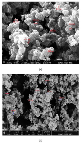 As shown in Figure 2, the scanning electron microscope of either MIPs or non-imprinted polymers (NIPs) nano-beads can present a picture for the surface morphologies of the obtained polymers. The MIPs beads showed a semi-uniformed spherical shape with a size distribution of 255.8–486.2 nm, whereas the NIPs particles were of irregular and much smaller (a size distribution of 125.5–218.9 nm). This can indicate that the presence of harmine as a templated molecule has a great influence on the shape of the polymer formed, in which the template-monomer complex can change the solubility of the growing polymer. This has a great influence on altering the polymer morphology [42,43].