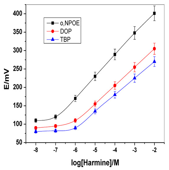 The selectivity coefficients of membrane sensors with different plasticizers were shown in Table 2. Selectivity for harmine in presence of other common organic cations such as harmaline, strychnine, cinchonine, quinine, brucine, adrenaline and caffeine were enhanced with o-NPOE membrane-based sensors. All subsequent measurements were carried out using membranes-based o-NPOE plasticizer.