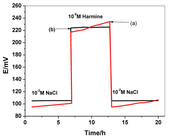 Water-layer test for (a) C/harmine-ISE and (b) C/PEDOT:PSS/harmine-ISE.