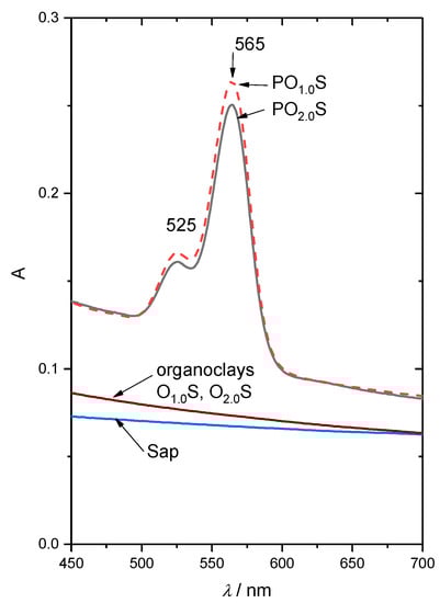 The films had an area of 4.84 cm2 containing 0.6 mg Sap, which represents 0.124 mg cm−2. The surface concentration of the dye in the films (ΓPhB) can be estimated using Equation (3), the measured absorbance from the maxima of the PhB bands, and considering the value of εPhB. The values ΓPhB were estimated to be 1.711 × 10−6 and 1.871 × 10−6 mmol cm−2 for PO2.0S and PO1.0S, respectively. The amount of dye adsorbed per unit mass of Sap was 1.38 × 10−2 and 1.51 × 10−2 mmol g−1 in PO2.0S and PO1.0S, respectively, which in both the films, is below 2% of the CEC value. The difference between these two films was negligible.
