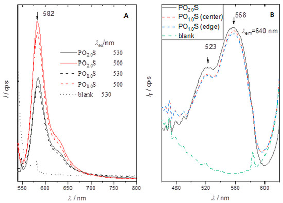 Fluorescence spectra of representative films of PO2.0S and PO1.0S. (A) Emission spectra were recorded after excitation at 500 or 530 nm. The slide with the organoclay O2.0S was used as a blank; (B) excitation spectra were recorded at 640 nm. The specimen PO1.0S was measured twice, from the middle and close to the edge of the film. The spectra recorded for the different spots on the film were practically identical. The film O2.0S of organoclay without PhB was measured as a blank.