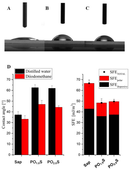 Water contact angles of: (A) Sap; (B) PO1.0S film; (C) PO2.0S film. (D) Water contact angles of distilled water and diiodomethane (right) and surface free energy (left) measured on samples of Sap, PO1.0S, and PO2.0S films.