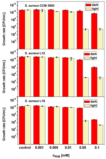 Antimicrobial efficiency of PhB against S. aureus CCM 3953, L12, and L18 strains without and after 2.5 h irradiation with green LED light. Samples were cultured in the presence of different concentrations of PhB with 1 h pre-incubation.